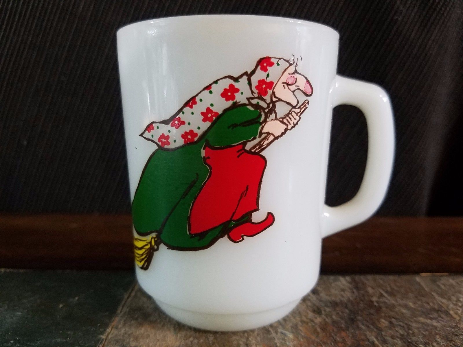 Title (ebay affiliate link): Vintage Norwegian Kitchen Witch Anchor Hocking Milk Glass Mug