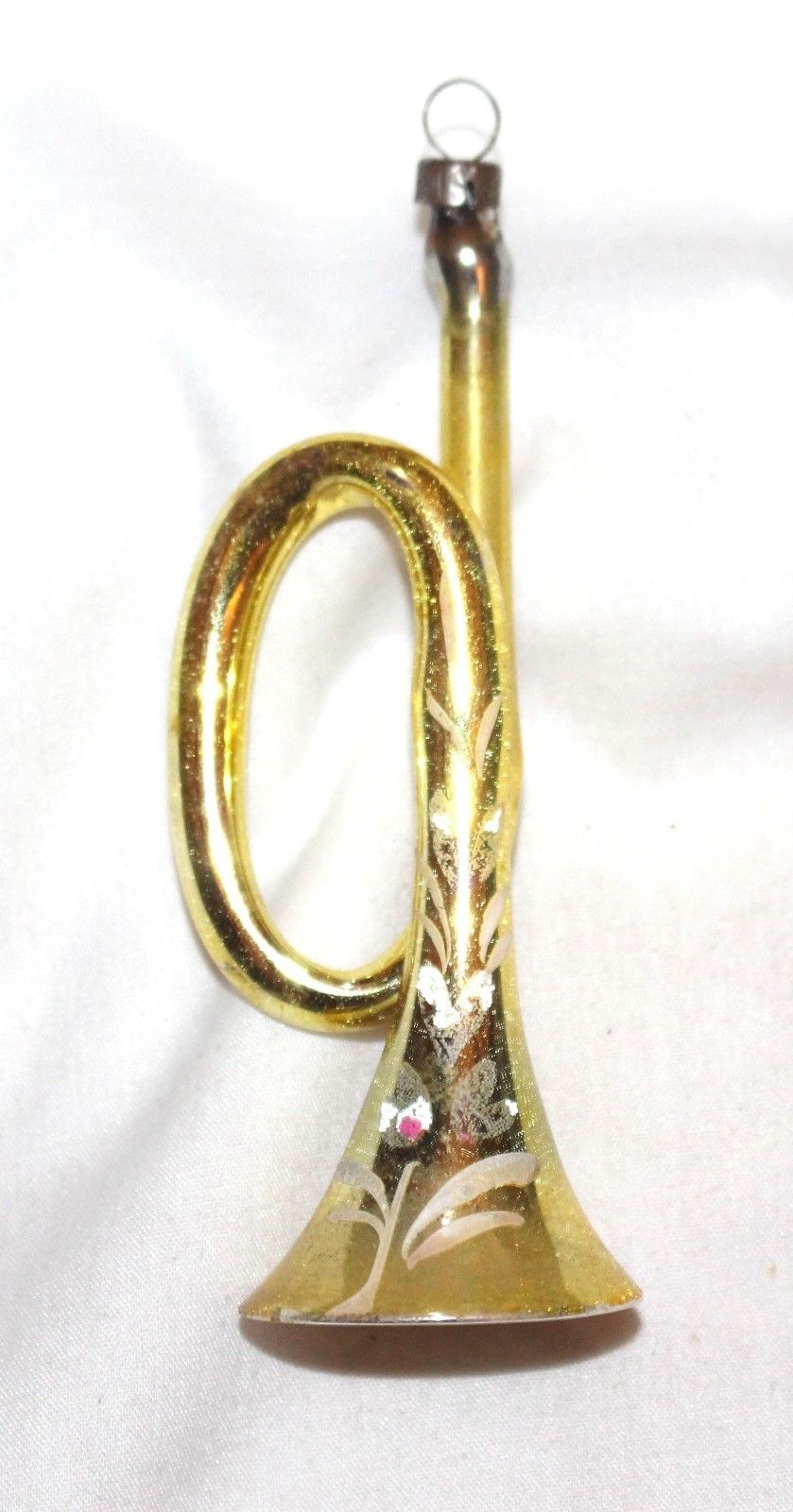 Title (ebay affiliate link): Gold Bugle, with Flowers & Leaves. Very nice 1920s German glass ornament.