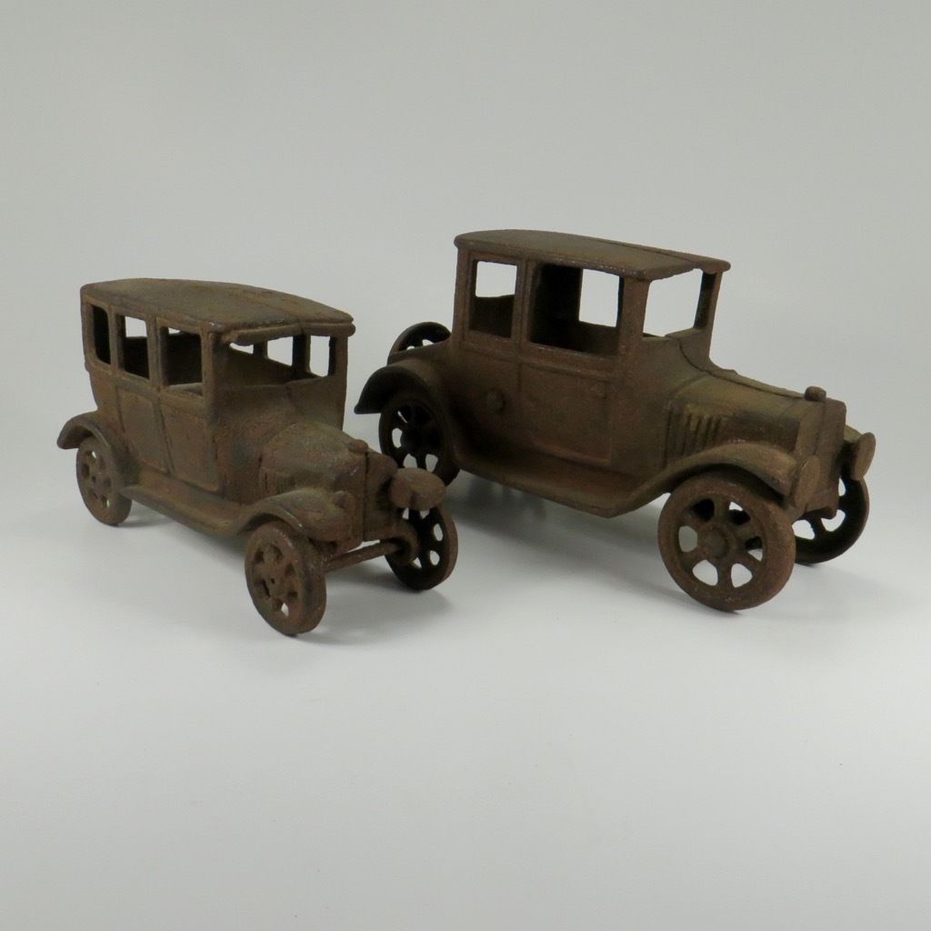 Two Vintage Antique Cast Iron Model A T Cars Ford Coupe Sedan Toy 6.25" & 8.5"
