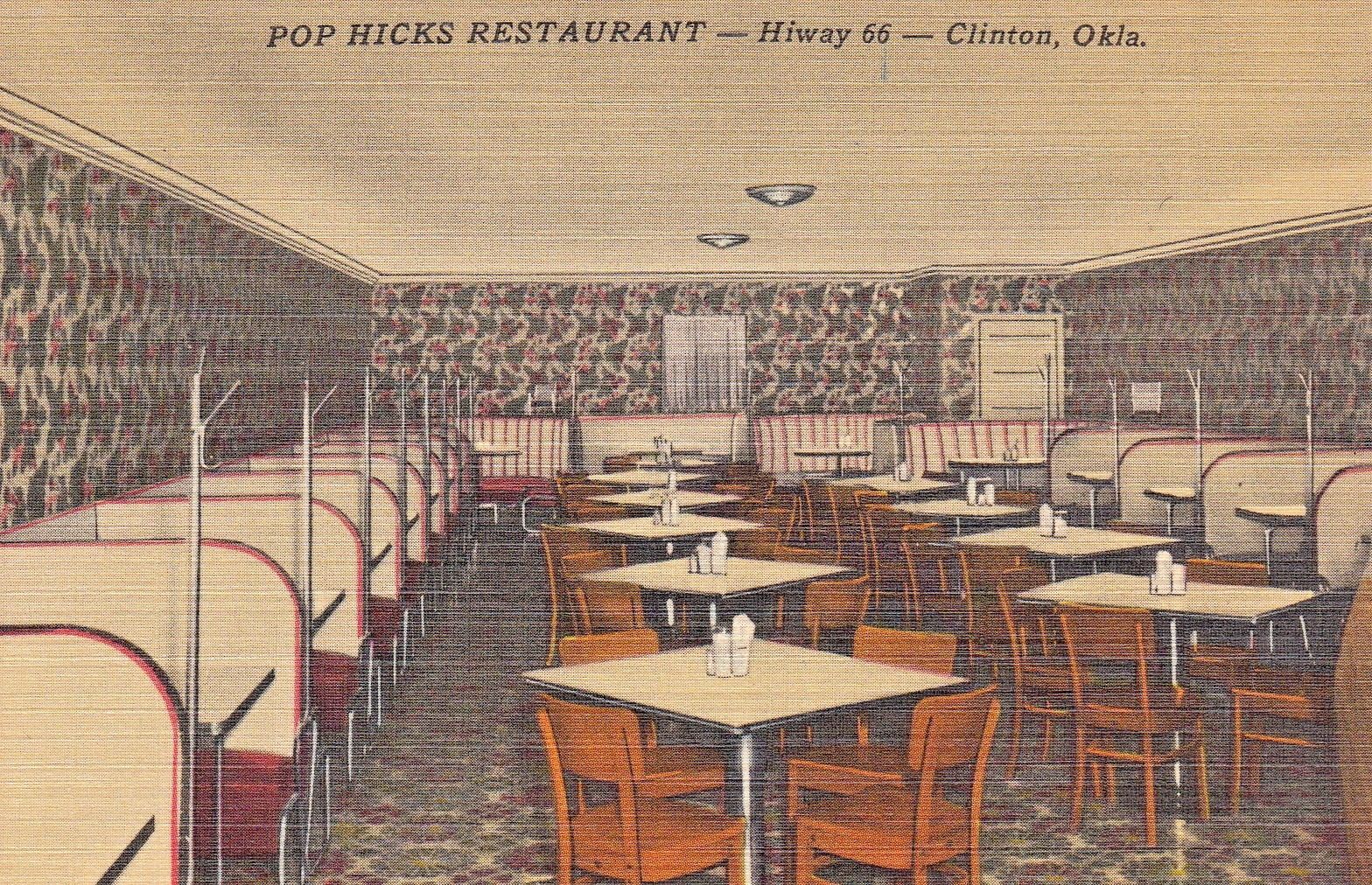 Title (ebay affiliate link): Route 66 Postcard Linen1940s POP HICKS RESTAURANT Clinton Oklahoma ICONIC