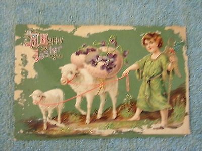 Vintage Postcard A Happy Easter, An Angel Girl With Sheep Carrying Easter Eggs