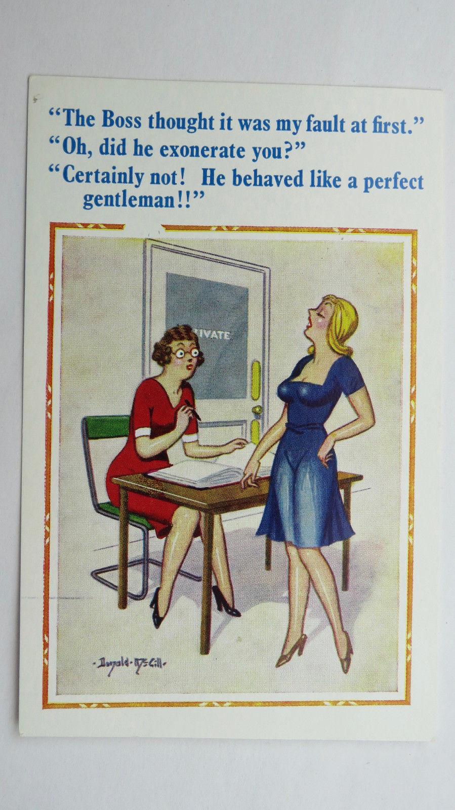 Title (ebay affiliate link): 1950 Risque Donald McGill Comic Postcard Office Boss Blonde Secretary Big Boobs