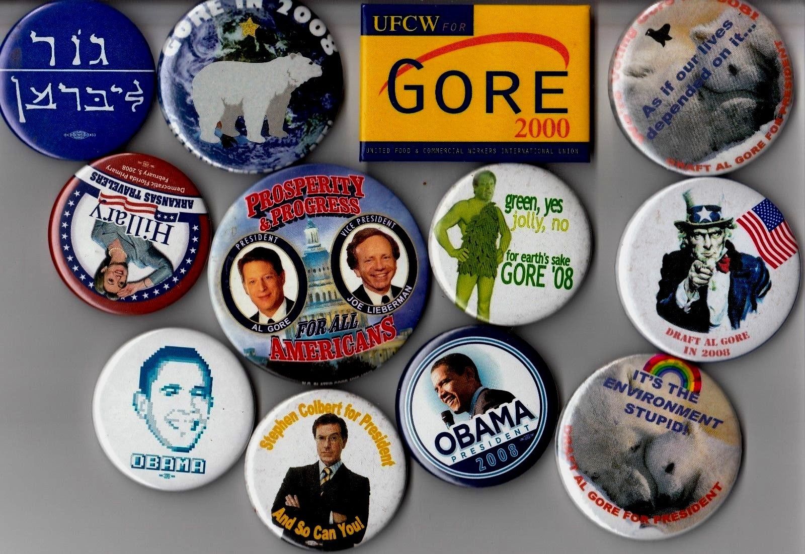 Title (ebay affiliate link): Pin Lot GORE OBAMA HILLARY COLBERT UNION Button 2000 2008 President Campaign