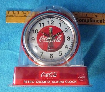 Title (ebay affiliate link): NIB Coca Cola Retro Quartz Alarm Clock,battery operated, metal case, glass lens