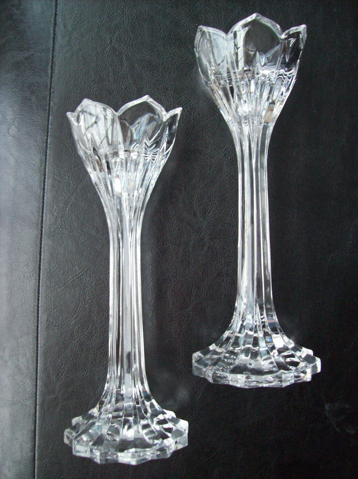 Title (ebay affiliate link): Collectible pair Tulip/Flower crystal clear tall 9 " candle holders, home decor