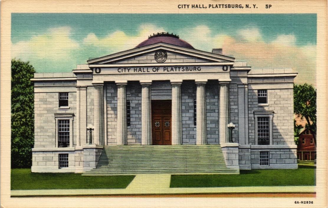 DR JIM STAMPS US CITY HALL PLATTSBURG NEW YORK LINEN COLORTONE POSTCARD