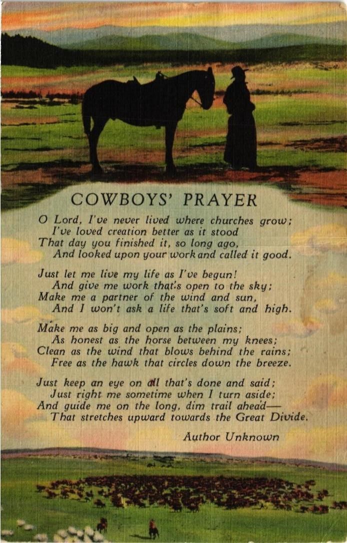 Title (ebay affiliate link): DR JIM STAMPS US COWBOYS PRAYER POSTCARD LINEN COLORTONE CREASED