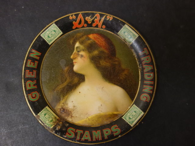 Title (ebay affiliate link): Early 1900s Tin Litho Tip Tray D. & N. Green Trading Stamps