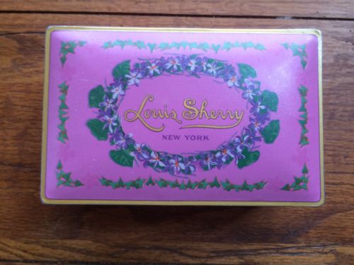 Vintage 1930s Louis Sherry lilac metal trinket tin chocolate gift box