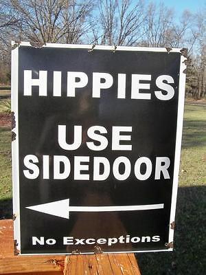 PORCELAIN SIGN HIPPIES USE SIDE DOOR NO EXCEPTIONS 16X13 WOODSTOCK