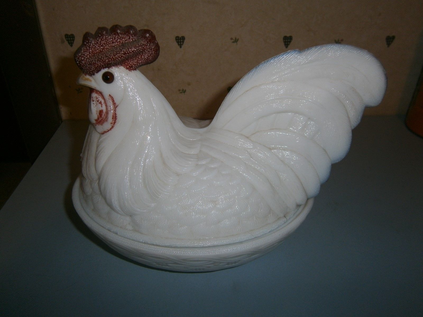 Title (ebay affiliate link): VTG WESTMORELAND WHITE MILK GLASS HEN ON A NEST COVERED DISH RED EYES~SPLIT TAIL