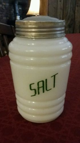 Ribbed Milk Glass Salt Shaker Green Letters Vintage 4.5"