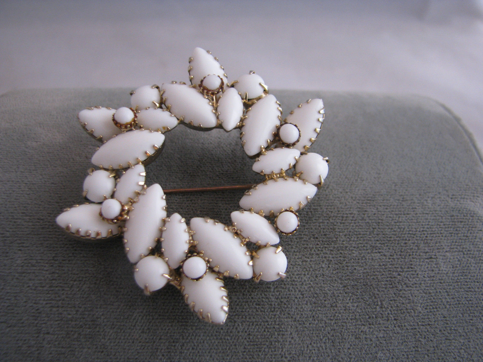 Title (ebay affiliate link): VINTAGE D & E JULIANA WHITE MILK GLASS RHINESTONES GOLDTONE BROOCH PIN