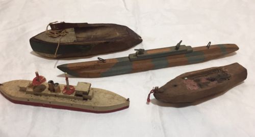 Title (ebay affiliate link): Primitive Lot of 4 Antique Hand Carved Small Wooden Toy Boat Ship Lot