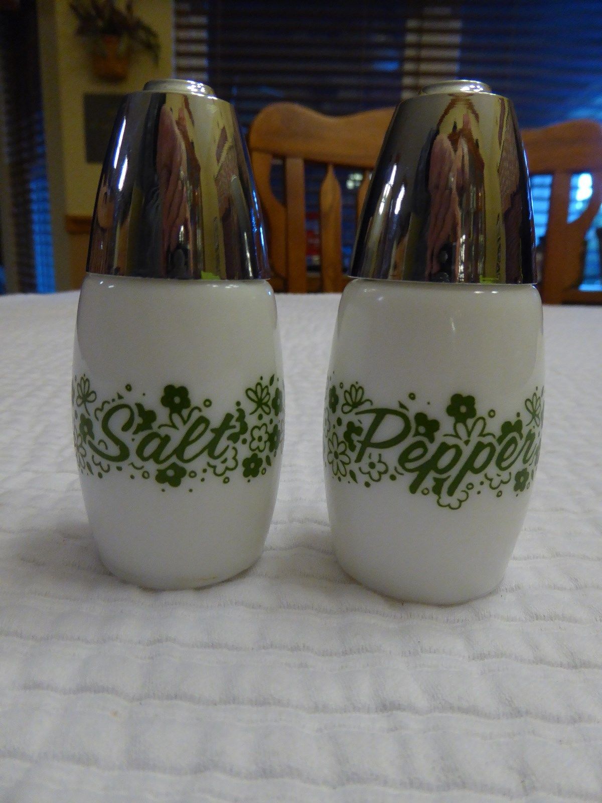 Title (ebay affiliate link): Vintage Corelle Spring Blossom Crazy Daisy Salt & Pepper Milk Glass Set