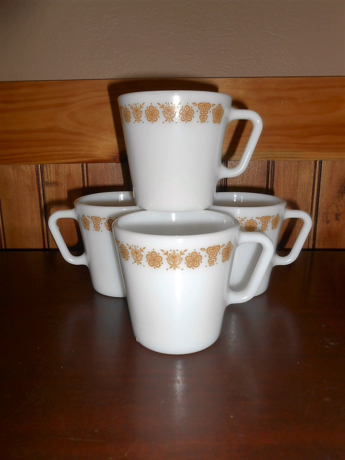 4 - Vintage Pyrex Milk Glass Dinnerware Pattern:Butterfly Gold Coffee Mugs Cups