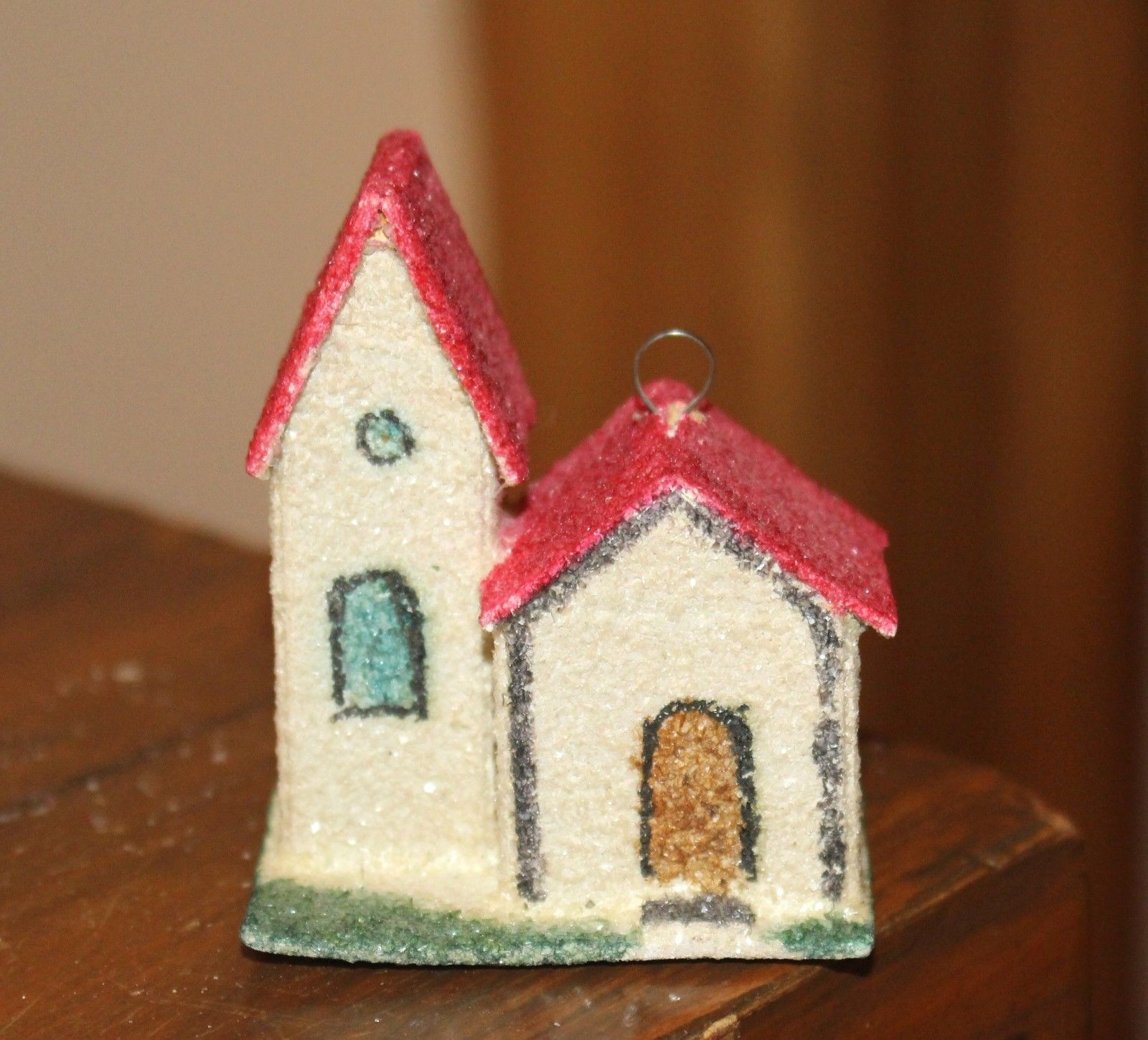 Title (ebay affiliate link): Miniature Czechoslovakian Church, with red roof. Cardboard Ornament. 1930s.