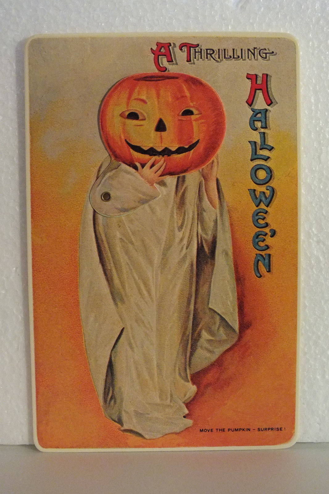 Title (ebay affiliate link): Vintage Holiday Chrome Postcard Thrilling Halloween Move the Pumpkin Child 1981