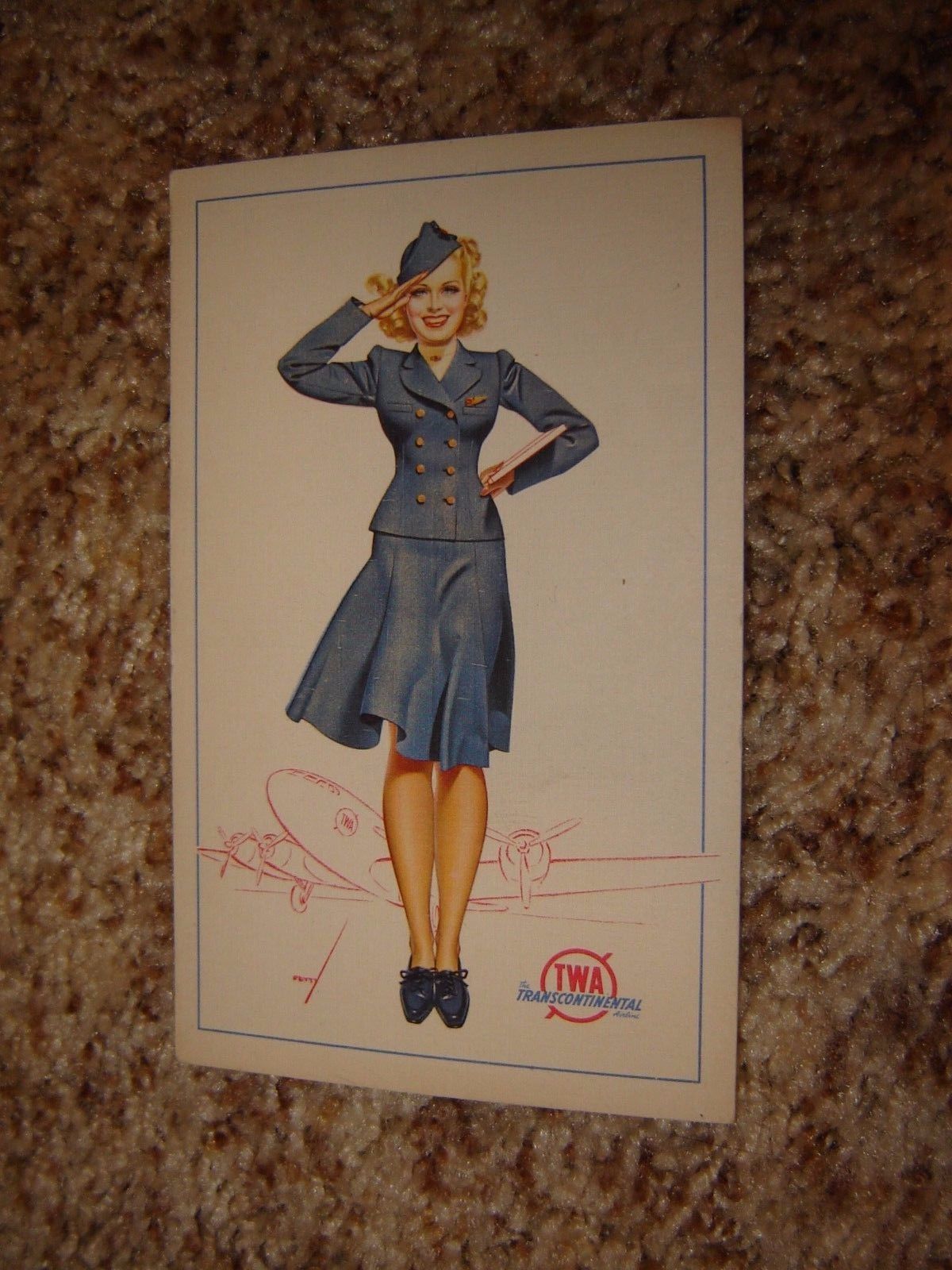 Title (ebay affiliate link): VINTAGE POSTCARD TWA AIRLINES ADVERTISEMENT STEWARDESS hostess airplane travel