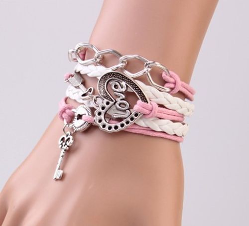 Title (ebay affiliate link): Infinity Love Heart Key Lock Friendship Antique Silver Leather Charm Bracelet