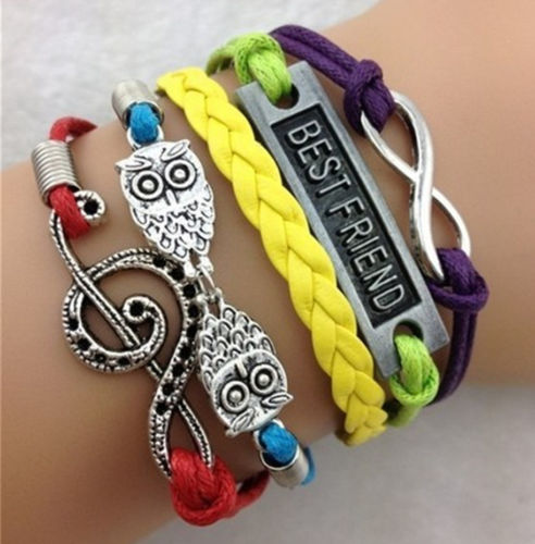 Title (ebay affiliate link): Lucky 8 Music Breaks owl Antique Silver Multicolor Leather Bracelet A01