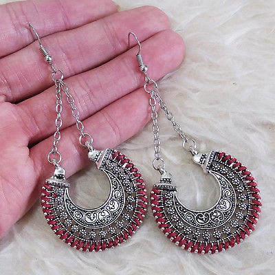 Title (ebay affiliate link): Vintage Womens Boho Antique-Silver Red Patterned Charm Dangle Drop Hook Earrings