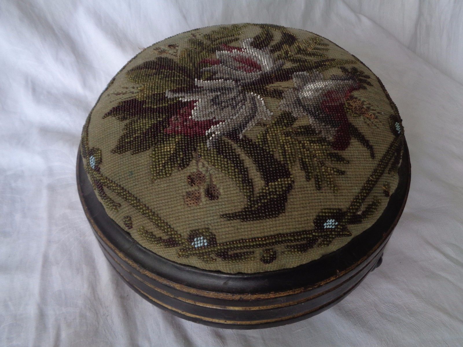 Title (ebay affiliate link): STUNNING ANTIQUE FLORAL BEADWORK SMALL CIRCULAR FOOTSTOOL VICTORIAN