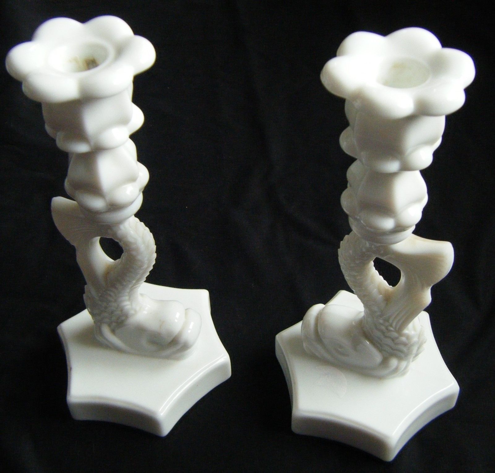 Title (ebay affiliate link): Pair of Vintage Westmoreland Milk Glass Dolphin Koi Pedestal Candle Holders