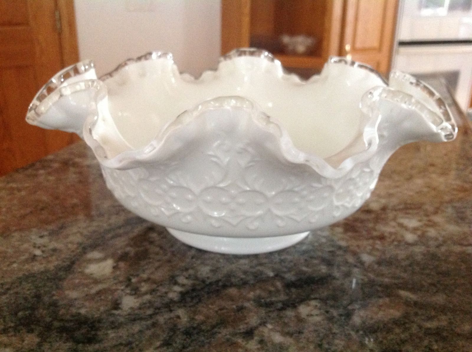 Title (ebay affiliate link): FENTON LARGE 9.5" SERVING BOWL SILVER CREST Ruffled Rim White Milk Glass Vintage