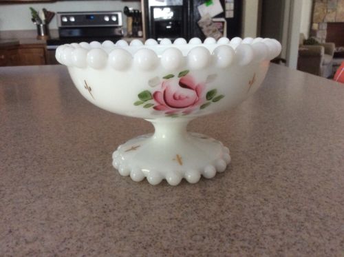 Title (ebay affiliate link): VINTAGE HAND PAINTED MILK GLASS COMPOTE ROSES GOLD GILT ELEGANT CANDLEWICK DISH