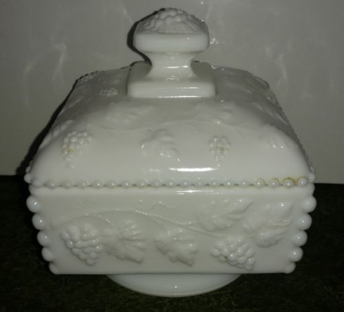 Title (ebay affiliate link): Vintage White Milk Glass Westmoreland Square Candy Dish "Harvest Grape"
