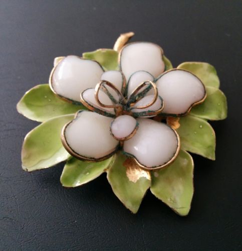 Title (ebay affiliate link): Vtg Signed HATTIE CARNEGIE Milk Glass Enamel Flower Blossom Brooch Pin Z4