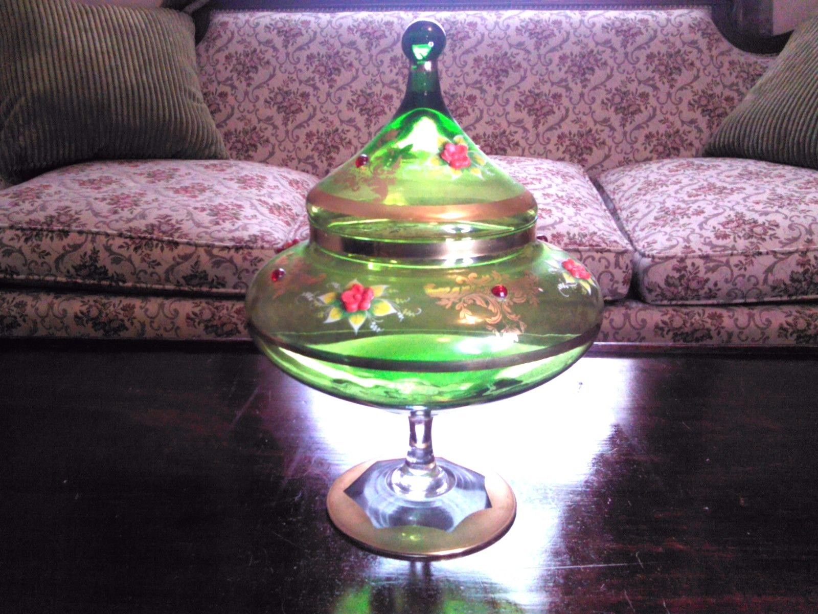 Title (ebay affiliate link): Antique Bohemian Glass Covered Compote-Green-Gilt-Ruby Dots-Excellent Condition