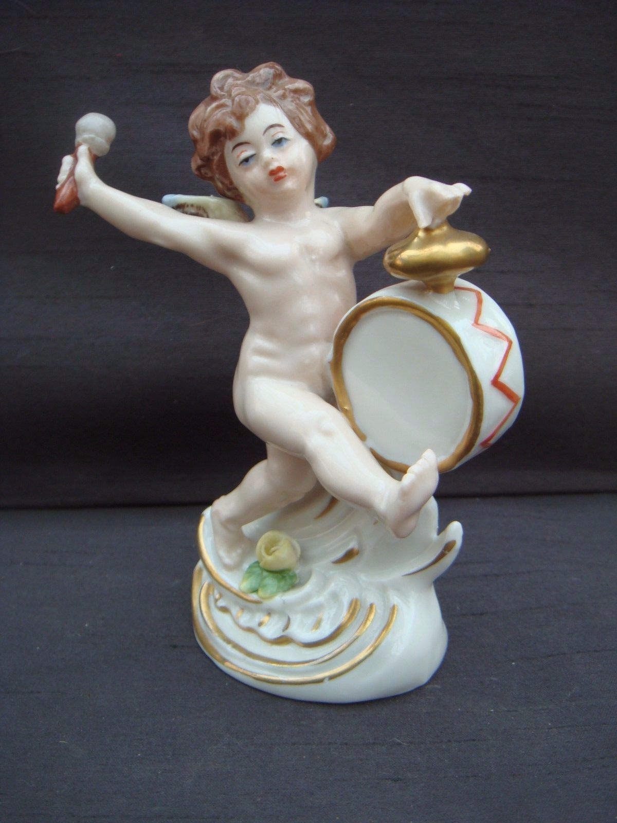 Title (ebay affiliate link): VINTAGE CAPODIMONTE FIGURINE CHERUB PUTTI PLAYING A DRUM GILDED FIGURE