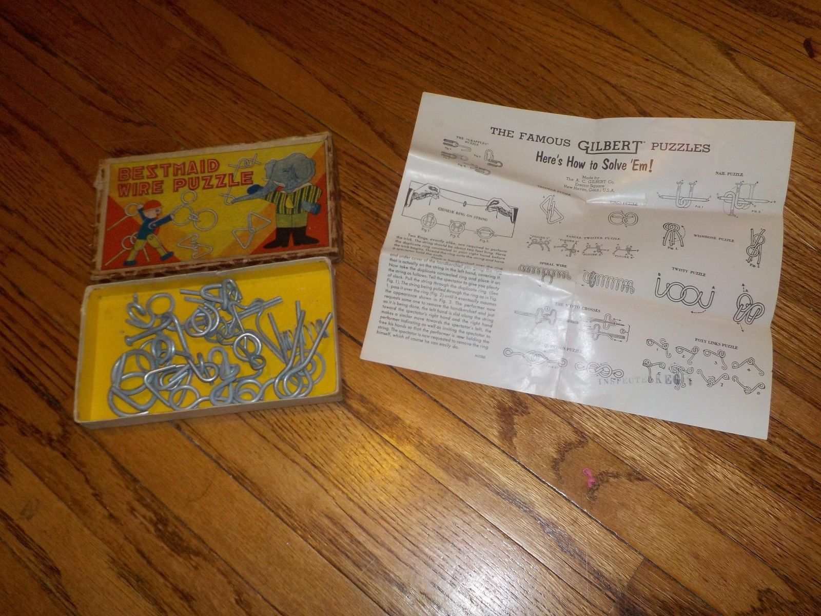 Title (ebay affiliate link): ANTIQUE, VINTAGE BESTMAID WIRE PUZZLE TOYS, GILBERT, ORIG BOX, ELEPHANT ON COVER