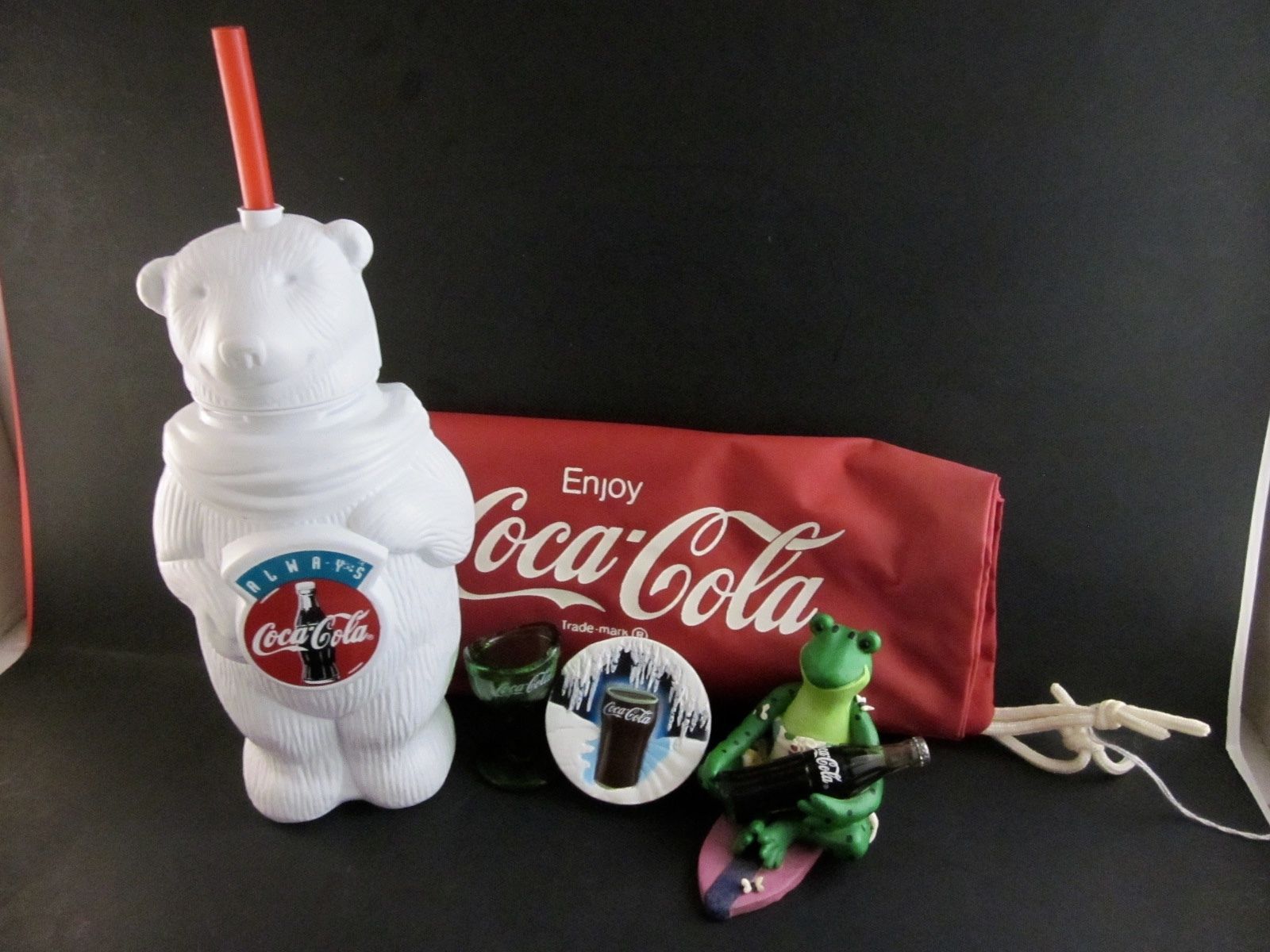 Title (ebay affiliate link): Coca Cola bear travel mug, magnet, glass, frog knick knack & Coke bag (5 Items)