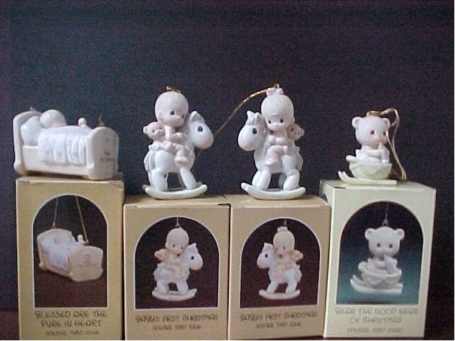 Title (ebay affiliate link): Precious Moments ORNAMENTS set of 4 /baby/Cradle, B&G Rocking Hors, Bear/Sled