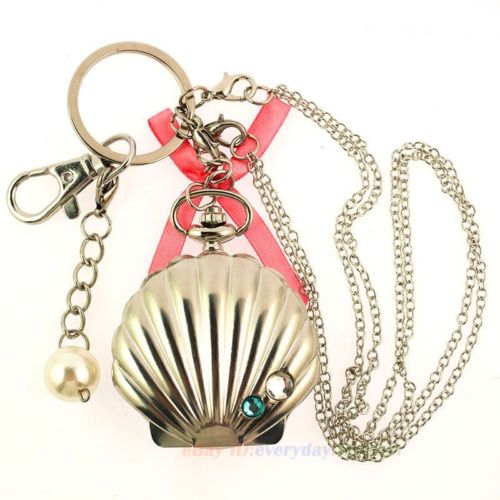 New Silver Pearl Shell Womens Ladies Pocket Watch with Quartz Movment Keychain