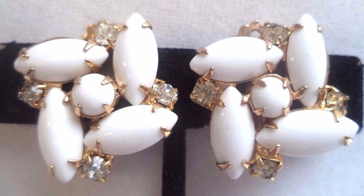 Title (ebay affiliate link): STUNNING VINTAGE ESTATE HIGH END MILK GLASS RHINESTONE CLIP 1" EARRINGS!!! G5552