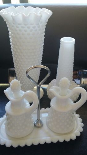 Title (ebay affiliate link): WHITE HOBNAIL MILK GLASS OIL & VINEGAR TRAY CRUET SET 3 PIECES plus 2 vases