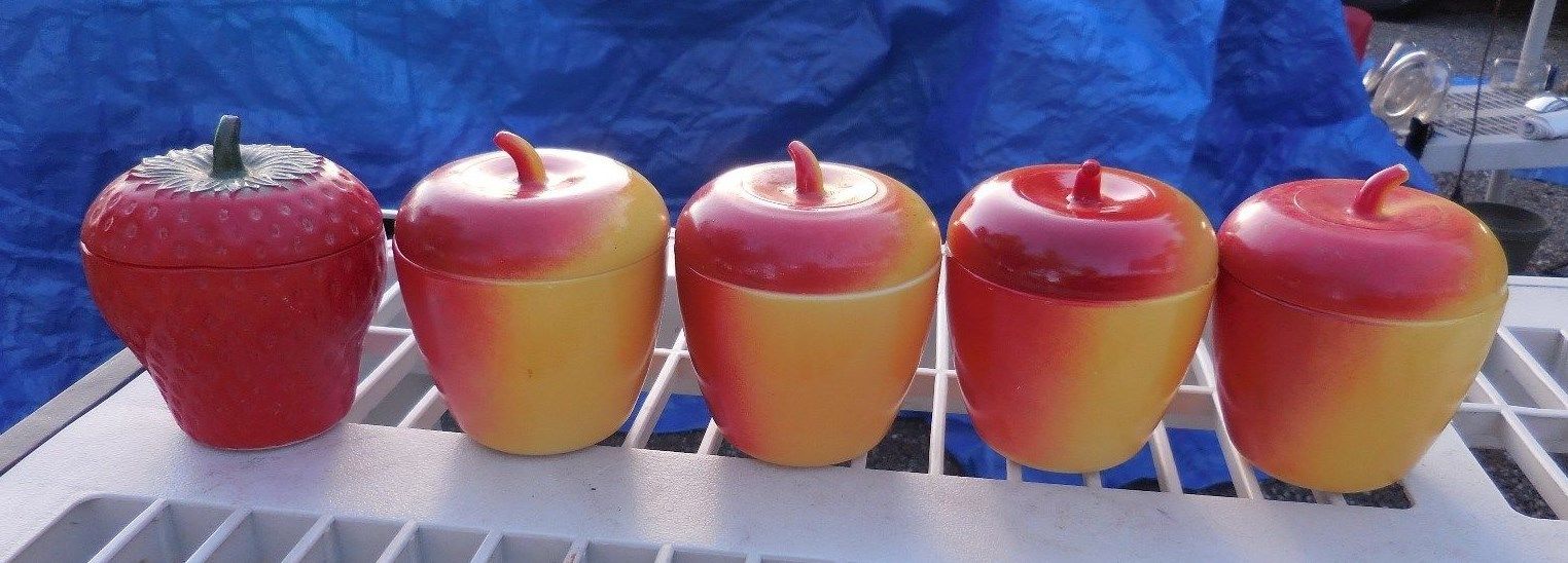 Title (ebay affiliate link): Vintage Hazel Atlas Milk Glass Apple & Strawberry Jam Jelly Jar w/ Lids