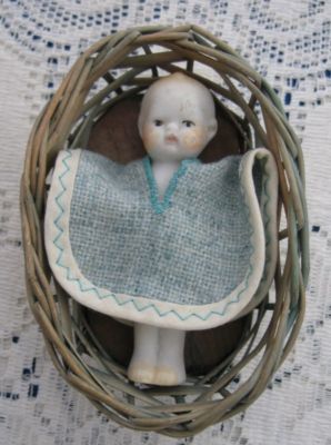 Adorable Antique Japan Bisque Doll In Wicker Cradle