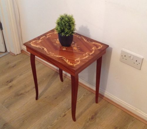 Title (ebay affiliate link): VINTAGE INLAID MARQUETRY MUSICAL TABLE SCREW LEGS SEWING ARTS CRAFT STORAGE