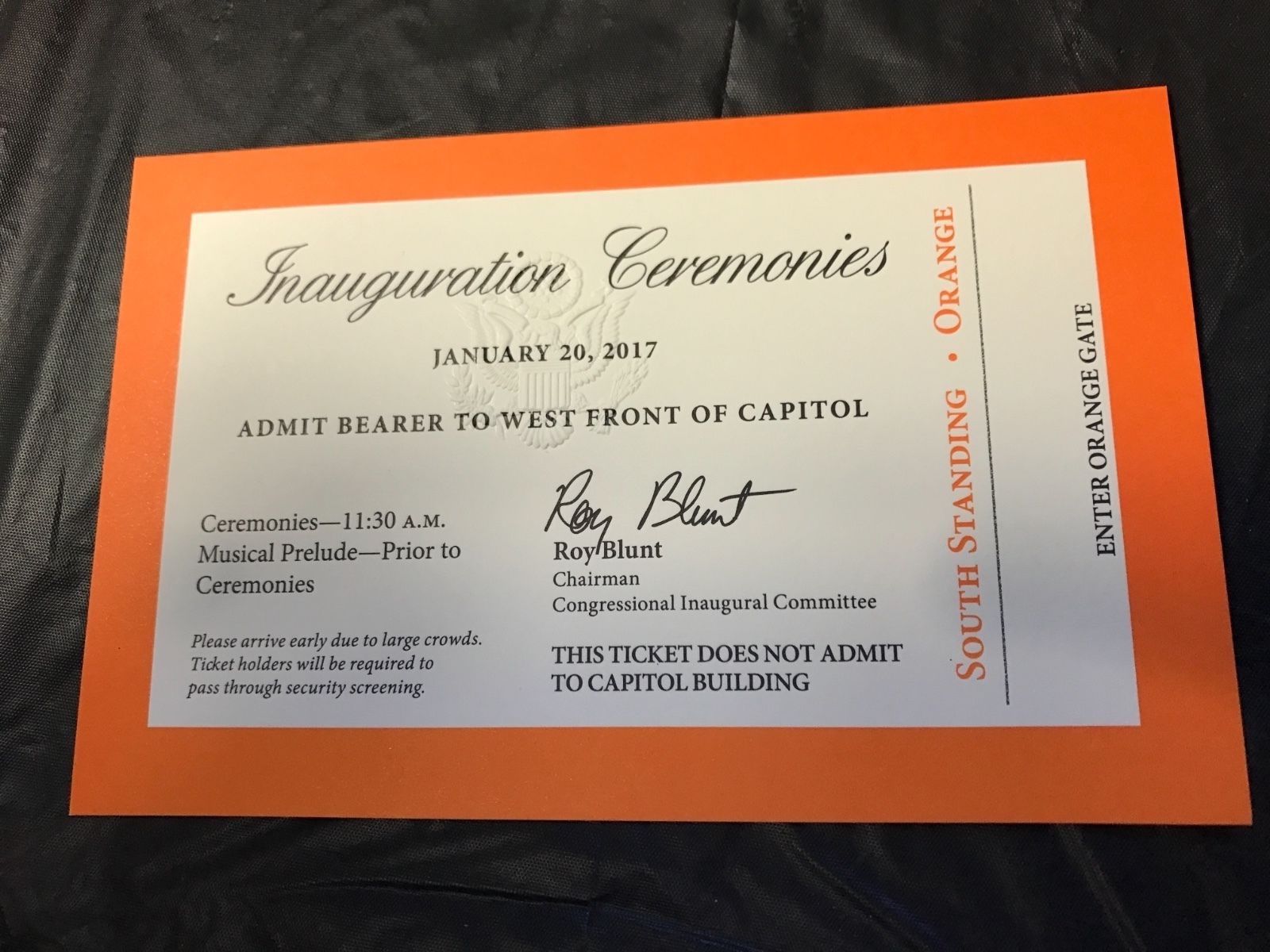 OFFICIAL Donald J. Trump Jan. 20, 2017 Presidential Inauguration Orange Ticket