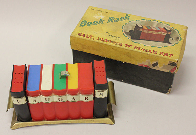 Title (ebay affiliate link): Miniature Bookcase Salt, Pepper & Sugar Set with Box, Vintage