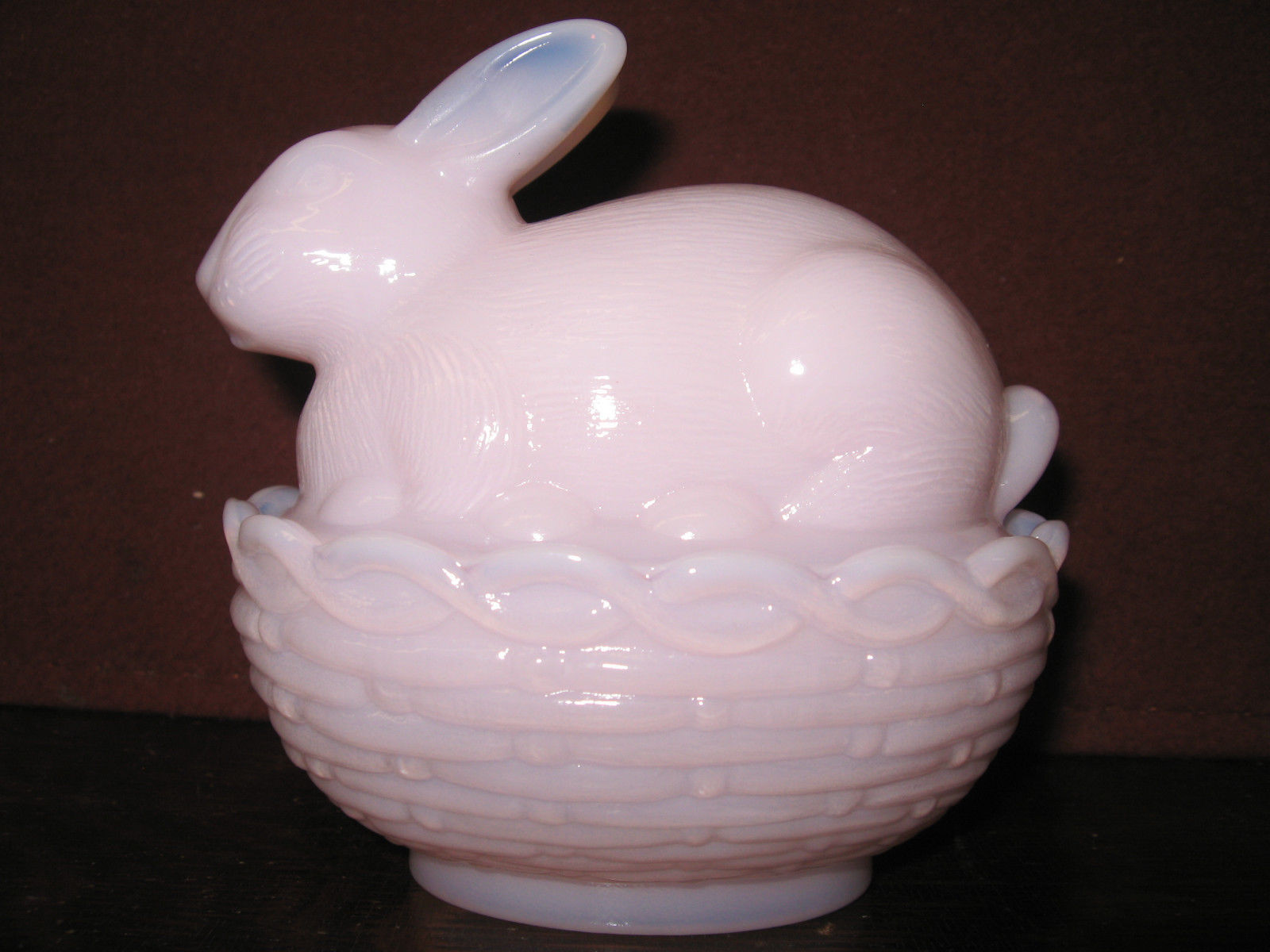 Title (ebay affiliate link): Pink milk glass bunny rabbit on nest basket candy dish easter eggs crown tuscan