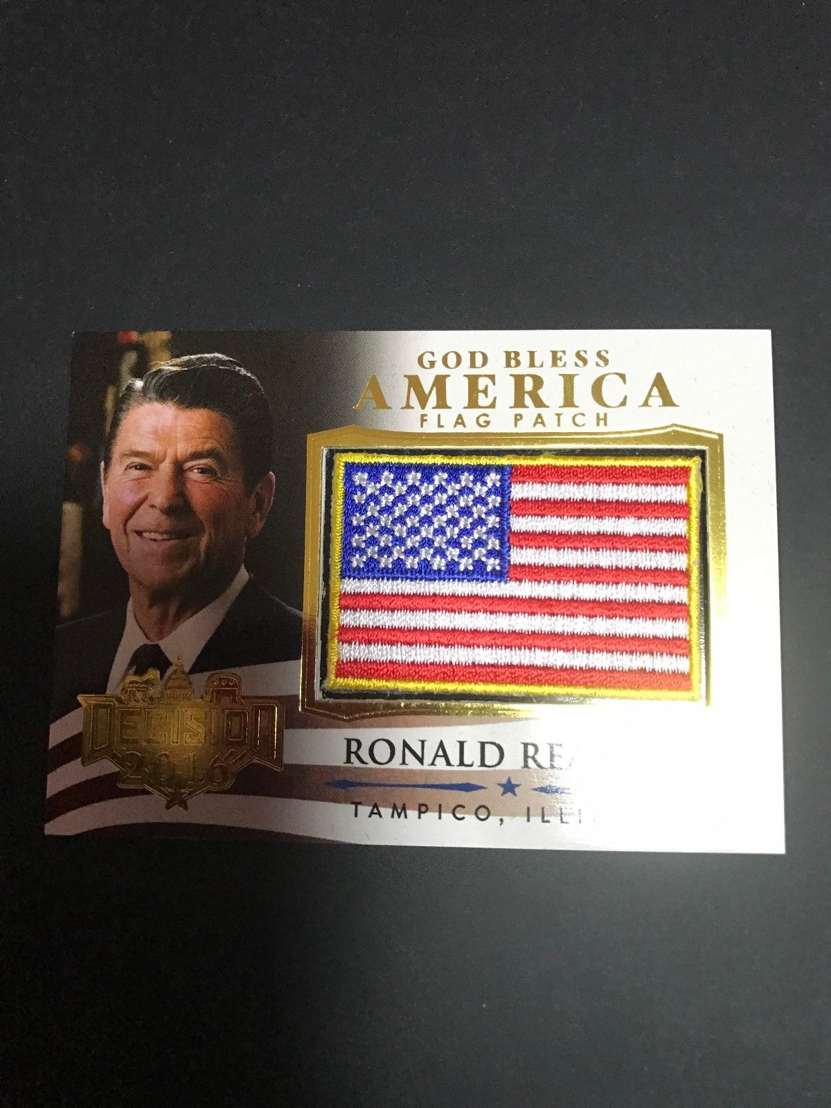 Title (ebay affiliate link): 2016 LEAF DECISION 2 GOD BLESS AMERICA FLAG PATCH GOLD RONALD REAGAN GBA36 RARE