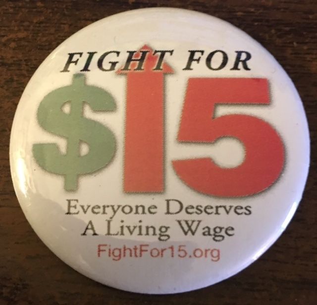 Title (ebay affiliate link): 2 1/4" Fight for $15 (An Hour) Everyone Deserves A Living Wage Cause Pinback
