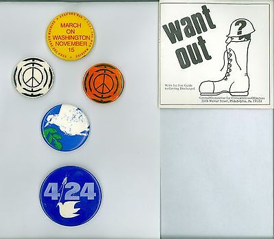 Title (ebay affiliate link): 5 Vintage 1960s-70s Peace & Anti Vietnam War Pinback Buttons &1 Flier March