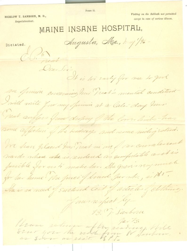 1896 Letter From Maine Insane Hospital Regarding Patient''s Condition